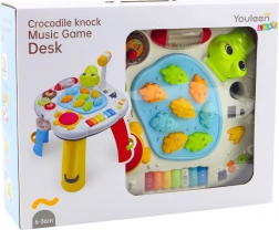 Ontdek de leuke en stimulerende interactieve tafel voor de allerkleinsten, die leren en spelen combineert. Dankzij het piano met dierengeluiden, lichteffecten, hamerspel en de interactieve krokodillenkop ondersteunt hij de ontwikkeling van motoriek, auditieve waarneming en oog-handcoördinatie.