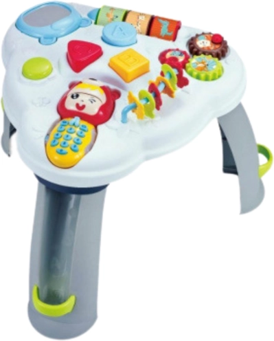 Interactieve educatieve tafel voor de allerkleinsten die plezier en leren combineert. Dankzij , geluiden en melodieën en tal van bewegende elementen stimuleert hij de fijne motoriek, oog-handcoördinatie en logisch denken. Onderdeel is een interactieve telefoon op batterijen, kleurrijke knoppen, draaiknoppen en vormen om te sorteren – een ideale keuze vanaf circa 6 maanden.