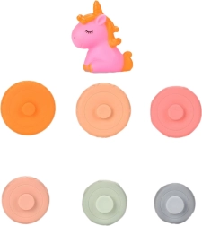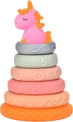 Deze bouwset bestaat uit zeven elementen, waaronder een schattige eenhoorn en zes zachte ringen die vrij kunnen worden gestapeld en aangepast. Elke ring heeft unieke patronen en texturen, inclusief cijfers en letters, wat tactiele ontwikkeling en vroeg leren bevordert door middel van spel.