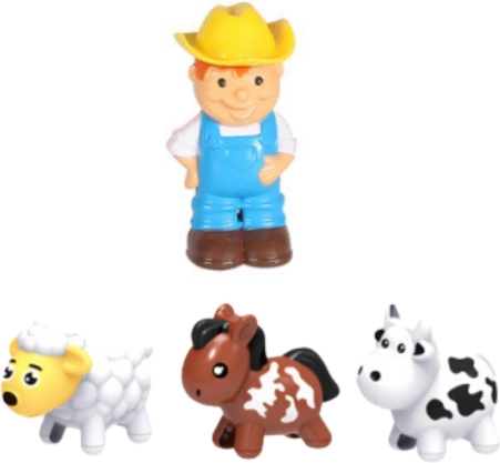 De set bevat ook een boerenfiguur met een gele hoed en figuren van een paardje en een schaap, die kinderen naar wens met de tractor kunnen vervoeren.