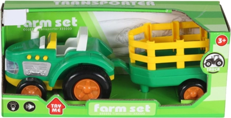 Deze boerderijset bevat een groene tractor met een gele aanhanger en figuren van een boer en dieren. De tractor heeft een realistische look met licht- en geluidseffecten die elke kleine fan van rijdend speelgoed zullen aanspreken. De lichten branden en de geluiden worden geactiveerd met knoppen aan de zijkant van de tractor.