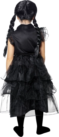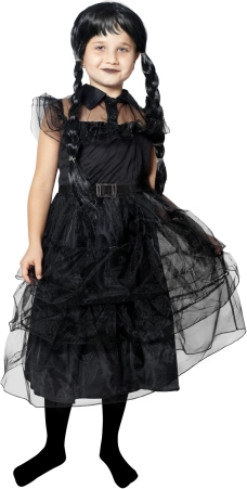 Zwarte gotische jurk met rijke lagen en volants voor een betoverende, licht mysterieuze look die op elk feest opvalt. Dit kinderkostuum voor Halloween en carnaval is ideaal voor rollenspellen, schoolvoorstellingen en thematische feestjes.