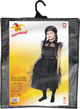Breng een vleugje mysterie naar carnaval en Halloween met dit kinderkostuum: een zwarte gotische jurk met romantische volants, een riem met gesp en een elegante kraag. Ideaal voor fans van de donkere stijl, in maat S (4–6 jaar) en voor een lengte van 105–116 cm. Pruik niet inbegrepen.