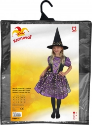 Geef de kleine tovenares een outfit waarin ze straalt op elk feestje. De paars‑zwarte jurk met gouden stippen, geplooide mouwtjes en een opvallende rok creëert een betoverende look die de aandacht trekt. De bijpassende hoed maakt het kostuum compleet en klaar om meteen te dragen.