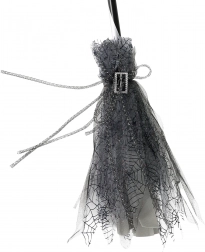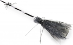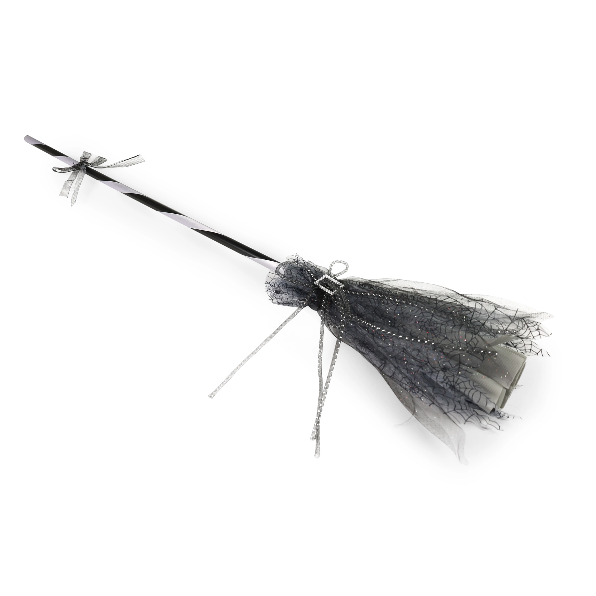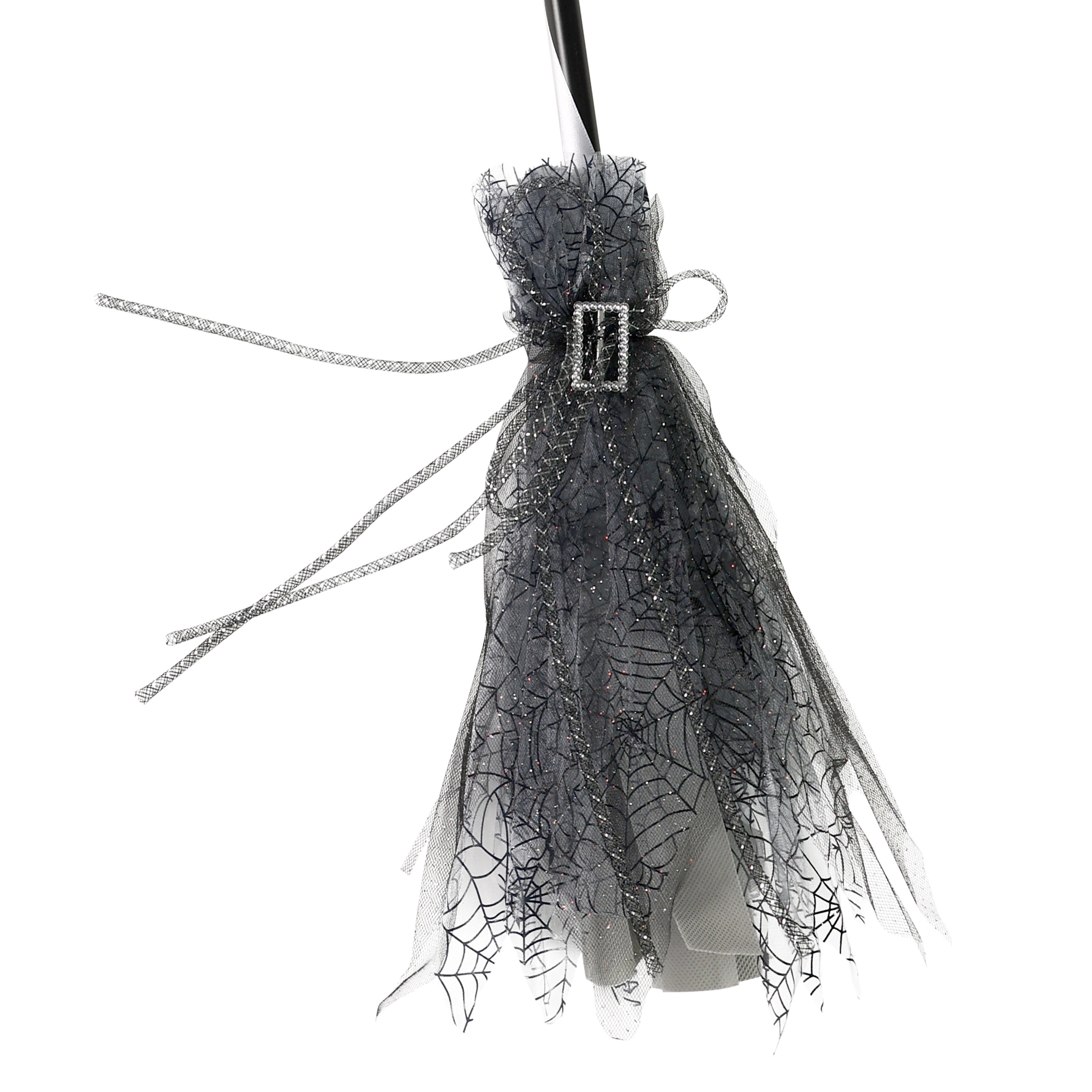 Geef je heksenkostuum de perfecte finishing touch. Deze heksenbezem in elegant zwart‑grijs, versierd met een zilverkleurige gesp en een subtiel tule “rokje”, maakt bij elke stap een grootse indruk. Hij ligt licht in de hand, waardoor poseren en dansen op de dansvloer gemakkelijk gaat.