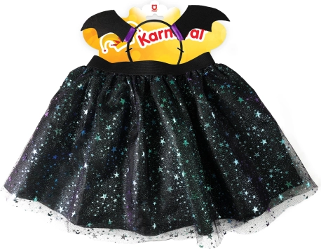 Schattig kostuum voor kleine heksjes met een luchtige tuturok met sterrenpatroon en een haarband met vleermuisvleugels. Ideaal voor Halloween, carnaval en verkleedpartijtjes thuis. De rok heeft een comfortabele elastische tailleband en een lengte van ca. 30 cm, waardoor hij perfect past voor kinderen van 3–7 jaar.
