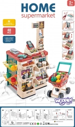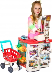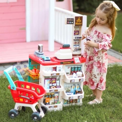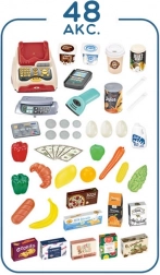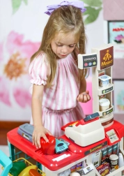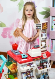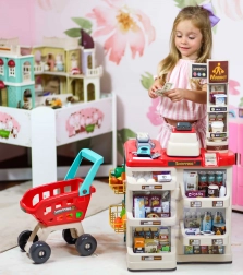 - supermarkt met planken en prijskaartjes, kassa met lade, betaalterminal, scanner met licht en geluid, weegschaal, winkelwagen, papieren geld, betaalkaart, kunststof etenswaren (fruit, groenten, dranken, zuivel enz.)