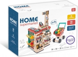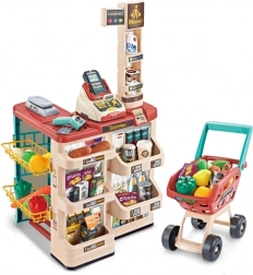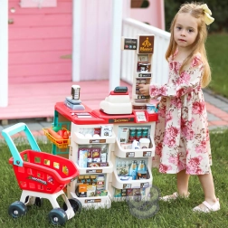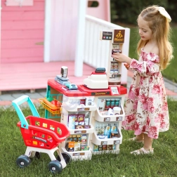 Inclusief een stabiele winkelwagen en 48 accessoires: fruit, groenten, dranken, zuivelproducten, papieren geld en een betaalkaart – alles voor een complete boodschappenervaring.