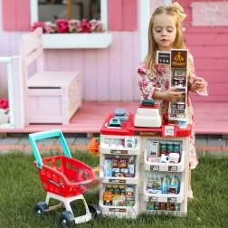 De WOOPIE kindershop verandert de kamer in een kleine supermarkt. Kinderen proberen de rol van verkoper en klant uit, scannen producten met de oplichtende scanner met geluid, wegen fruit op een imitatie van een echte weegschaal en betalen bij de kassa contant of met kaart. Ook inbegrepen is een stabiele winkelwagen voor een nog authentiekere beleving.