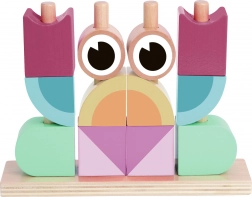 De set bestaat uit 18 onderdelen: een houten basis, 12 gevormde blokjes en 5 dubbelzijdige kaarten met voorbeelden. Kinderen kunnen bouwen volgens de patronen of hun eigen combinaties maken – van eenvoudige torens tot leuke “dieren”-composities. Veilige, niet-giftige verven en hoogwaardig hout zorgen voor een lange levensduur en een fijne grip voor kleine handjes.