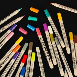 Deze set acrylmarkers verandert alledaagse voorwerpen in kunstwerken. Met 24 verschillende kleuren, inclusief twee metallics, kun je je creativiteit volledig uitleven en vergeten wat gewone markers niet kunnen bieden.
