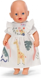 Schattig, licht en speels jurkje voor BABY born-poppen van 43 cm met een kleurrijke safari-print en mouwtjes met volant. Ideaal voor zonnige dagen en creatief spel. Inclusief een hanger van gerecycled materiaal. Zomerjurk voor poppen van 43 cm, safari-motief met giraffe, mouwen met volant, hanger van gerecycled materiaal.