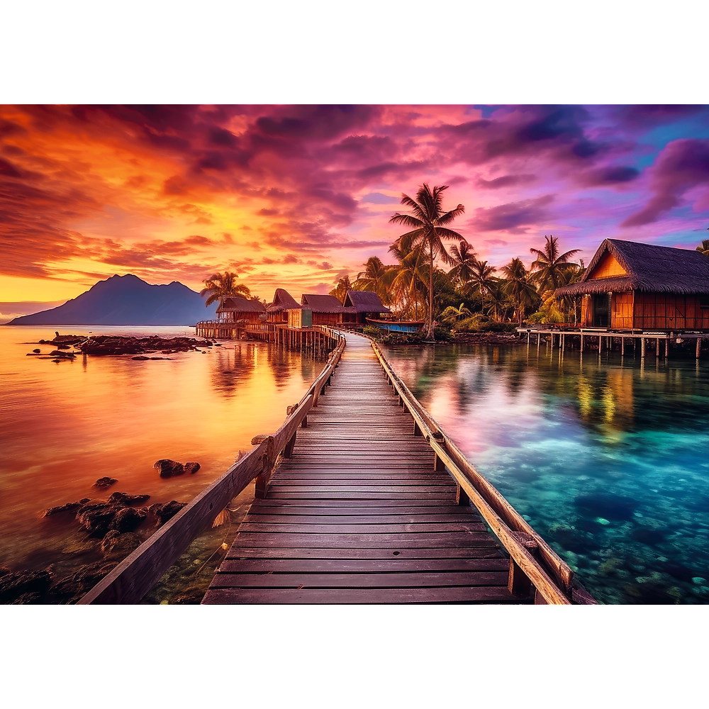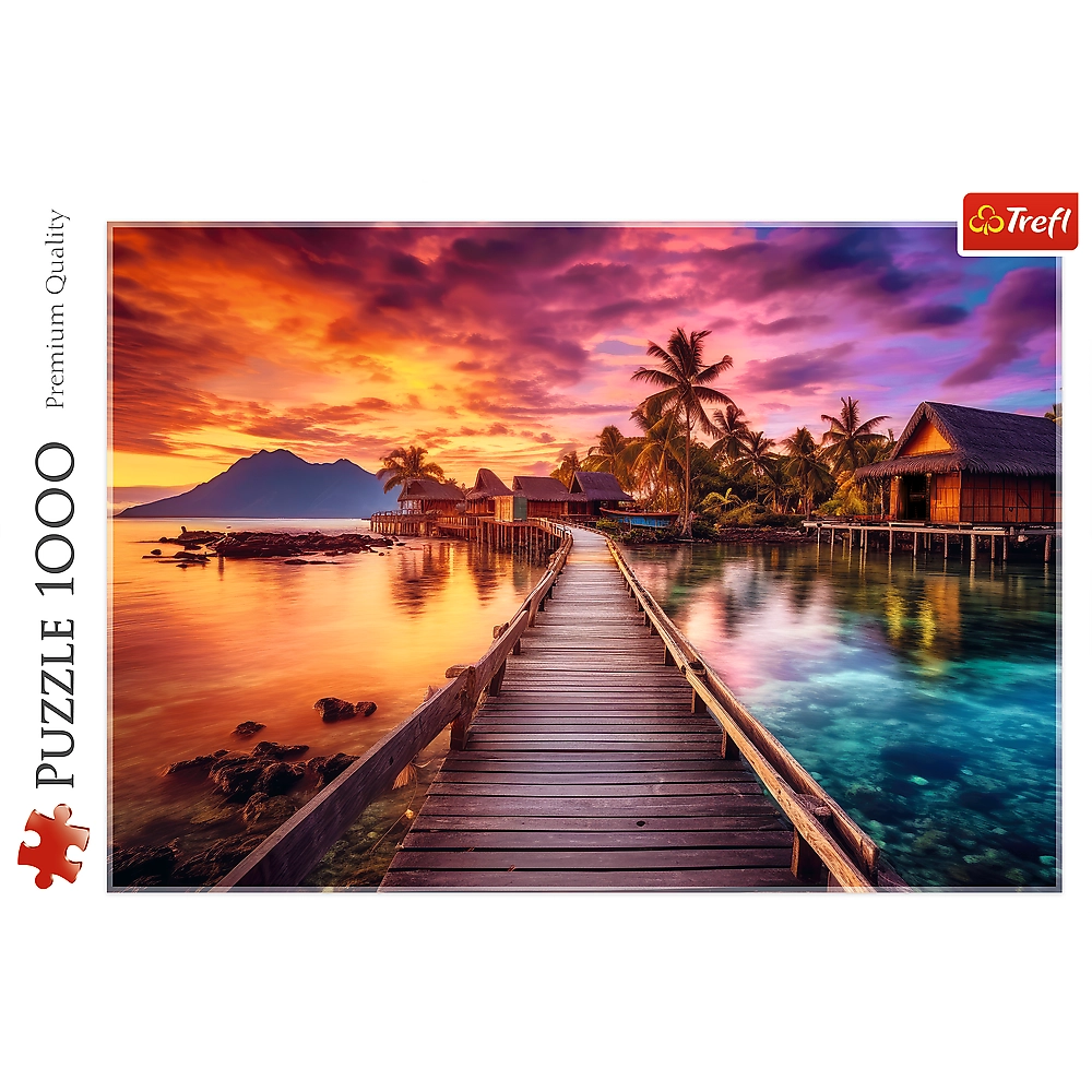 Ontdek ontspanning met de TREFL-puzzel met een paradijselijk eiland en een exotische zonsondergang. De set bevat 1000 stukjes die samen een gedetailleerde afbeelding vormen van 68,3 × 48 cm – ideaal om in te lijsten en als interieurdecoratie.