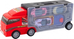 Deze rode vrachtwagen met garage en lanceerinrichting is een geweldige keuze voor kinderen die van auto’s, racen en het verzamelen van modellen houden. Het transparante trailergedeelte maakt het makkelijk om de opgeborgen autootjes te zien en de vakken bevorderen orde en zelfstandigheid tijdens het spelen.