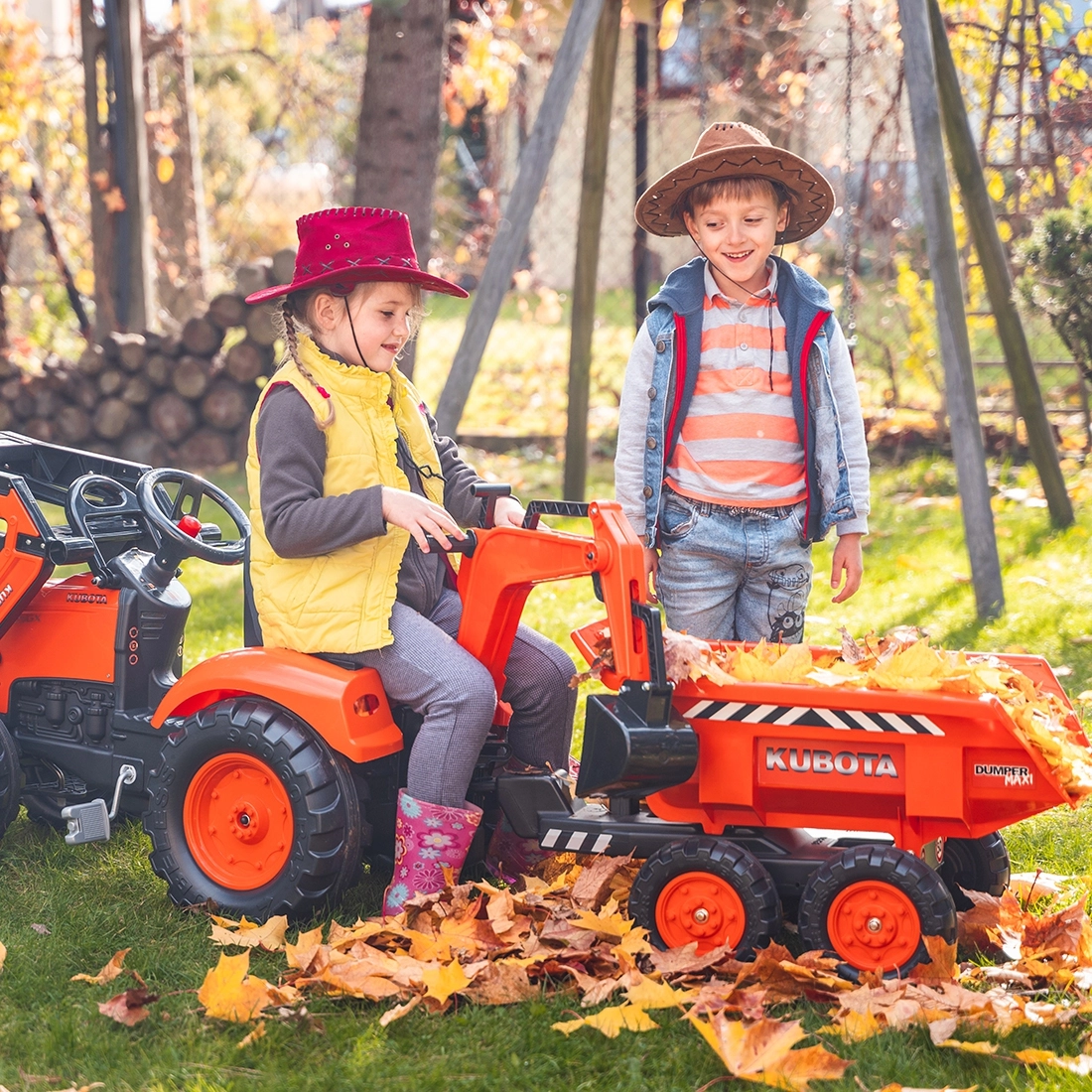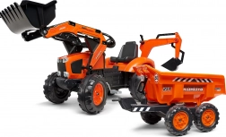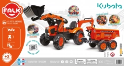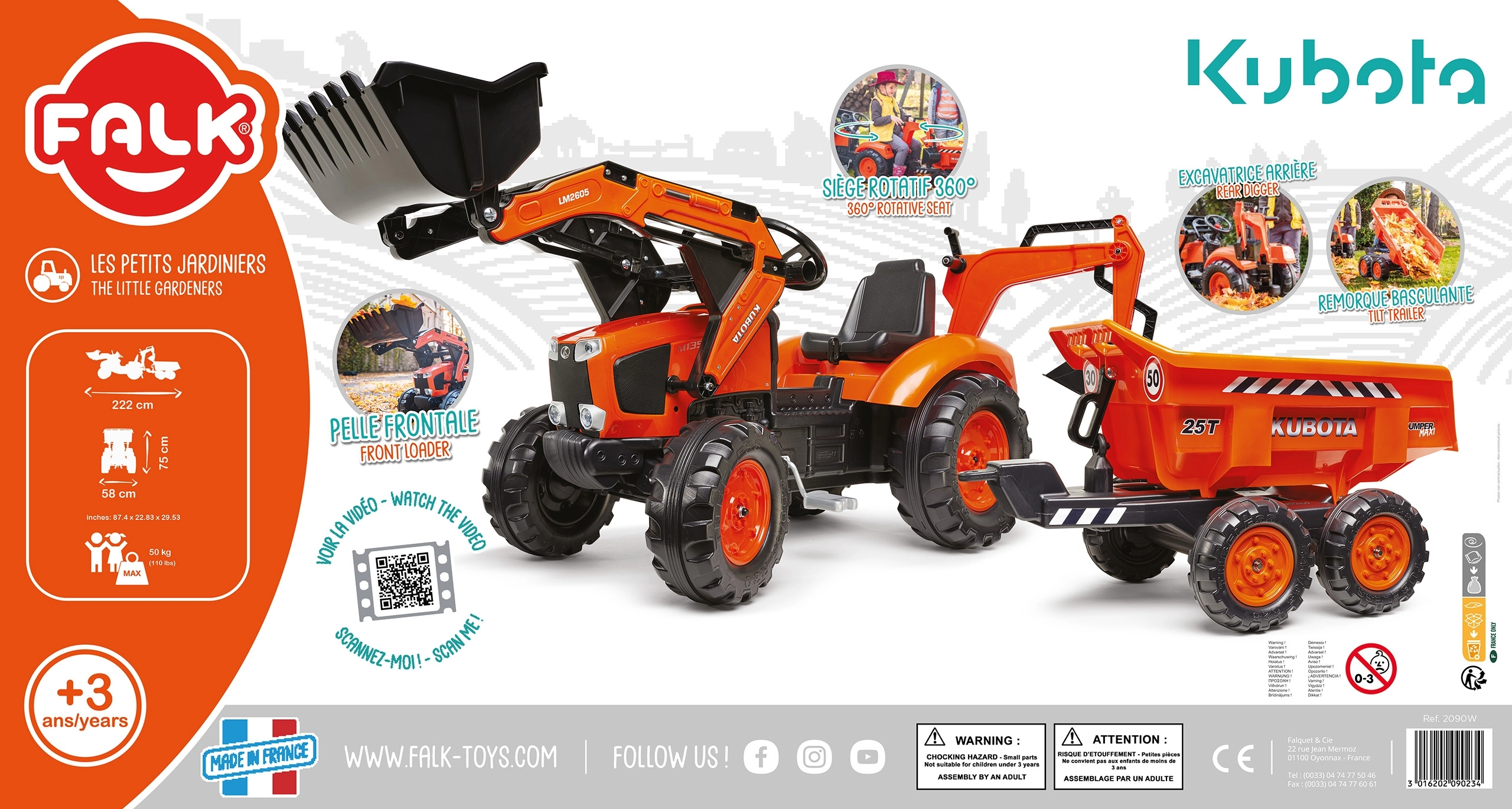 Tractor met aanhanger Kubota van het merk Falk is de droom van elke kleine tractorbestuurder! Deze gedetailleerde traptractor is het perfecte cadeau voor kinderen. De uitrusting omvat een werkende bak, lader en aanhanger. Gemaakt van hoogwaardig kunststof.