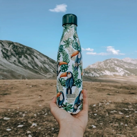 Stijlvolle roestvrijstalen thermosfles met een exotisch toekanmotief die je dranken langer op de ideale temperatuur houdt. Heeft een eenvoudig te reinigen constructie, een praktische inhoud van 500 ml en compacte afmetingen voor dagelijks gebruik naar werk, school en op uitstapjes.