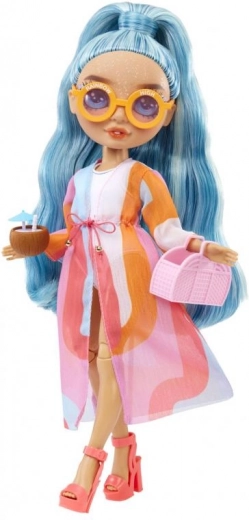 Een stijlvolle set kleding en accessoires voor RAINBOW HIGH-poppen met het zomerse thema Dag bij het zwembad. De set bevat een kleurrijke kimono, een witte badpak, roze sandalen met hak, een stijlvolle handtas, oranje zonnebril met logo en een schattige kokosdrank. Geschikt voor alle 11" RAINBOW HIGH-poppen en ideaal om stijlen te mixen en matchen.