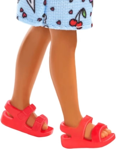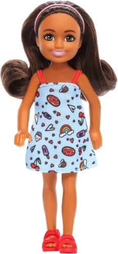 De pop valt op door een blauw jurkje met print van regenbogen, hartjes en lekkernijen, lang bruin haar met een roze haarband en rode sandalen. Combineer haar met andere Chelsea-poppen en accessoires (afzonderlijk verkrijgbaar) voor nog meer speelplezier.
