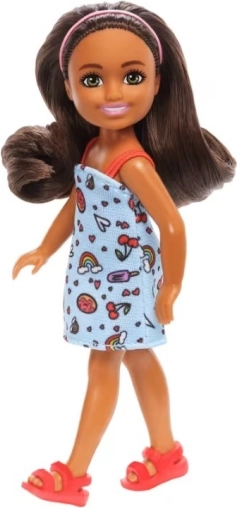 De kleine pop BARBIE Chelsea prikkelt de verbeelding en zorgt voor plezier bij het vertellen van verhalen. Ze draagt een schattig blauw jurkje met kleurrijke print (regenbogen, hartjes, lekkernijen), heeft lang bruin haar met een haarband en rode sandalen. Een geweldige keuze voor creatief spel en het uitbreiden van de collectie.