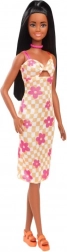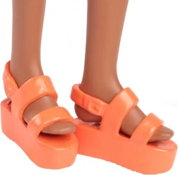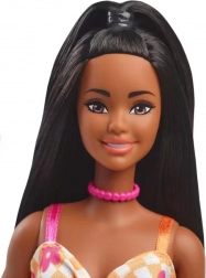 Een prachtige lange Barbie-pop met lange zwarte haren, gedeeltelijk opgestoken, versierd met een roze choker en oranje sandalen op plateauzolen. Haar uiterlijk wordt gecomplementeerd door een elegante jurk met bloemenmotief.