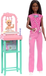Ontdek een wereld vol creatief rollenspel en carrièremogelijkheden met deze inspirerende Barbie kinderarts! Deze speelset bevat Barbie met haar patiëntje, inclusief een medische setting met een roze en groene zorgcorner.