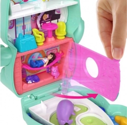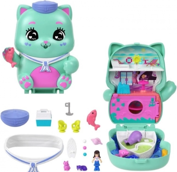 Ontdek de magie van zeeavonturen met deze geweldige set van Polly Pocket! De set heeft de vorm van een schattige kat die je kunt versieren met accessoires. Na het openen verandert hij in een meerdeks cruiseschip met cafetaria, hangmat en stuurwiel.