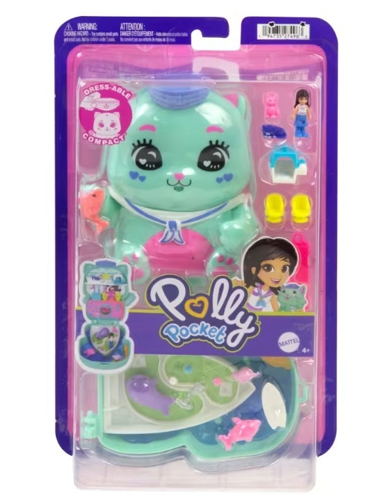 Compacte Polly Pocket-set met micropop en accessoires. Ontdek zeeavonturen met de schattige kat!