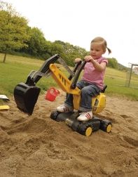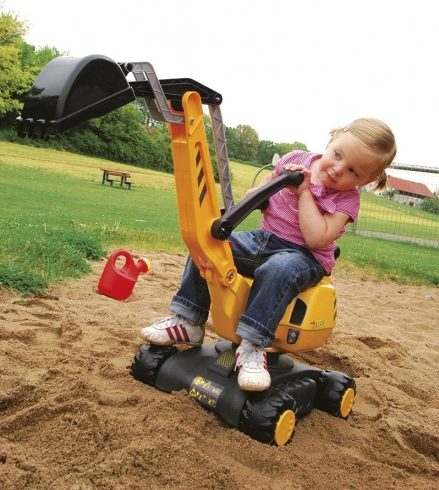 De gele graafmachine Rolly Toys rollyDigger is een robuuste rijdende graafspeelgoed voor kinderen vanaf 3 jaar, ideaal voor in het zand, in de tuin en op het strand. Biedt een volledig functionerende arm met 360° rotatie, automatische vergrendeling van de arm na het opscheppen van lading en een draagvermogen tot 50 kg voor veilig en realistisch spel.