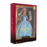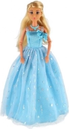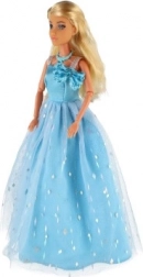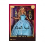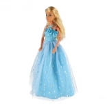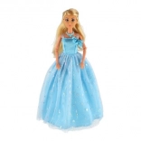 De pop draagt een lange blauwe jurk met een subtiel patroon en glinsterende details die meteen in het oog springen.
