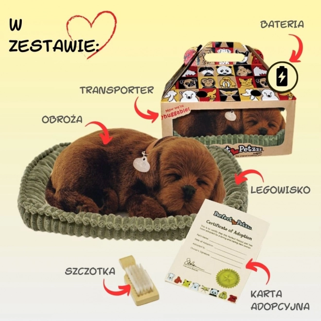 De zachte chocoladekleurige labrador oogt bijzonder realistisch – gesloten ogen, een zachte vacht, een halsband met label en een comfortabel mandje geven de indruk van een echt slapende pup. Het speelgoed ondersteunt een rustige sfeer in huis en in de kinderkamer en maakt zowel jonge als volwassen hondenliefhebbers blij.