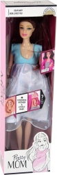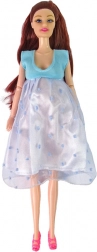 De pop heeft lang bruin haar in een paardenstaart, draagt een blauwe jurk met een wijde, gestippelde rok en roze schoentjes. Het is een perfect cadeau voor kinderen die van poppen houden en graag familieverhalen creëren. Het product voldoet aan de normen CE en EN71 en is dus veilig voor kinderen vanaf 3 jaar.
