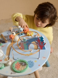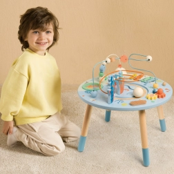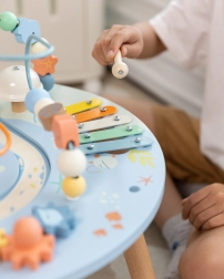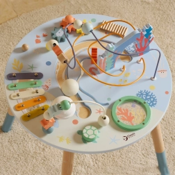 De Houten Activiteitentafel Zeeleven is een geweldige introductie in de wereld van vormen en kleuren. Veilig voor de allerkleinsten, gemaakt van hoogwaardig hout en beschilderd met niet-giftige verf. Kinderen worden aangemoedigd om staand te spelen, wat hun coördinatie en evenwicht ondersteunt. De educatieve voordelen van deze tafel zijn enorm, of het nu gaat om het verbeteren van de fijne motoriek of het ontwikkelen van muzikale vaardigheden.