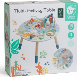 Houten activiteitentafel van het merk Classic World is het ideale speelgoed voor nieuwsgierige kinderen! Vol kleurrijke attracties, zoals vijf motorische activiteiten, tandwielen, een xylofoon en een trommel, brengt het veel plezier en helpt het tegelijkertijd belangrijke vaardigheden te ontwikkelen, zoals fijne motoriek, logisch denken en behendigheid.