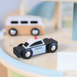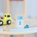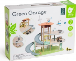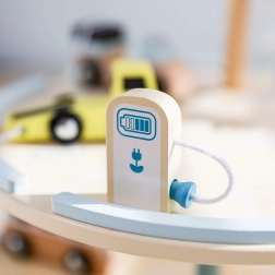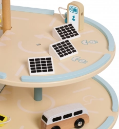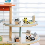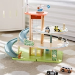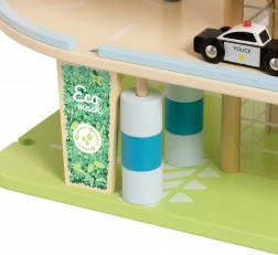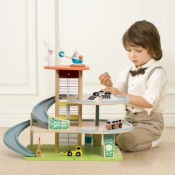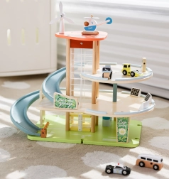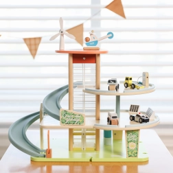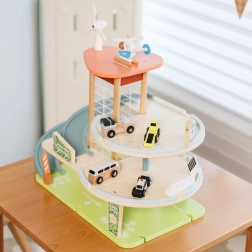 Dit houten drie-niveau parkeergebouw maakt het mogelijk speelgoed tussen de verdiepingen te verplaatsen dankzij een handbediende lift. Een speciale kronkelige helling zorgt voor een snelle afdaling van voertuigen. Bovendien is de uitrusting voorzien van een elektrische laadstation. De set omvat drie voertuigjes en een helikopter die urenlang plezier en kinderlijke fantasie stimuleren.