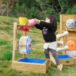 Deze outdoor water-speelset van geïmpregneerd natuurhout is de ideale aanvulling voor elke zandbak en tuin. Kinderen leren de principes van waterstroom en oorzaak–gevolg, terwijl het draaiende rad en de stroming door de gootjes plezier in ontdekken brengen.