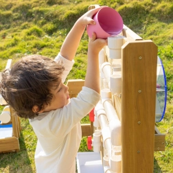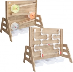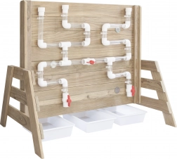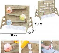De houten constructie van geïmpregneerd hout is weerbestendig en afgewerkt met een niet-giftige laag. Perfect als aanvulling op een zandbak en een buitenspeelplaats – biedt eindeloos speelplezier in een veilige omgeving voor experimenten met de waterstroom en het in beweging zetten van wielen.