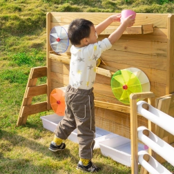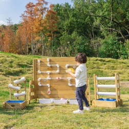 Deze dubbelzijdige wand combineert sensorisch water spel met STEM leren. De ene kant biedt kleurrijke waterwielen en goten om de waterstroom en oorzaak-gevolg te observeren, de andere kant brengt een netwerk van transparante en witte buizen met ventielen voor het regelen van de doorstroming. Kinderen trainen hun fijne motoriek, logisch denken en samenwerking.
