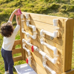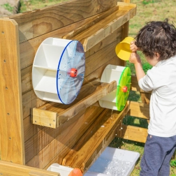 Eén zijde met kleurrijke waterwielen en goten, de andere met transparante en witte buizen en ventielen. Kinderen kunnen verschillende stromingen volgen en de richting en snelheid van het water veranderen.
