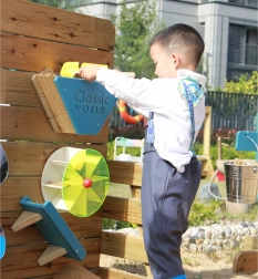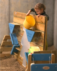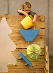 Dit houten spel ontwikkelt de fijne motoriek, het logisch denken en de creativiteit. Kinderen kunnen zand strooien of water gieten in de trechters, kijken hoe de stroom het molentje in beweging zet en langs goten naar beneden loopt, en zo oorzaak en gevolg ontdekken. In het midden trekt een spiegelende folie in boomvorm de aandacht, die het zintuiglijk waarnemen stimuleert.