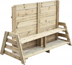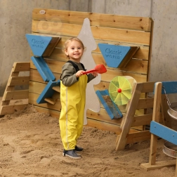 De constructie is gemaakt van geïmpregneerd grenenhout, dat bestand is tegen weersinvloeden en veilig is afgewerkt met een niet-giftige coating. De achterkant van het paneel bevat een praktische bank en een onderste plank voor het neerleggen van speelgoed – ideaal voor een korte pauze tussen het spelen door.