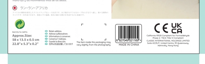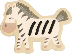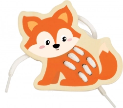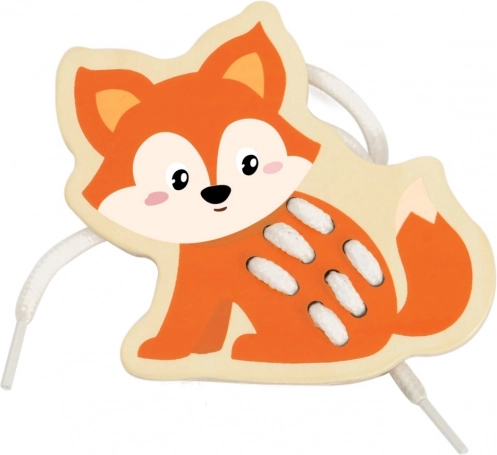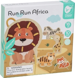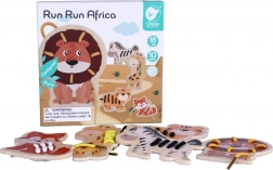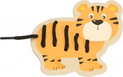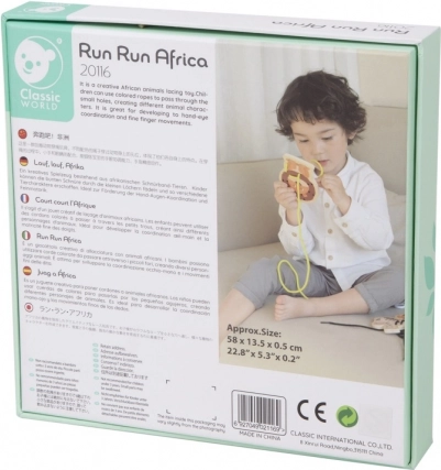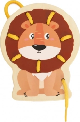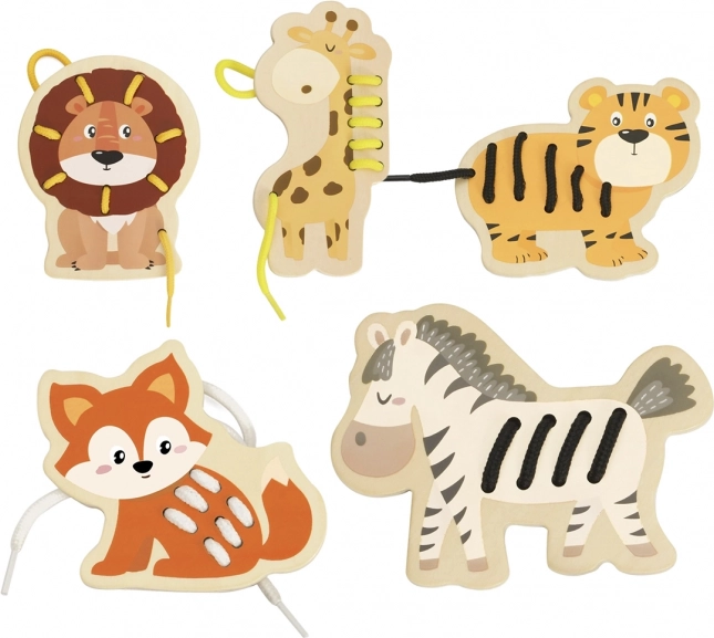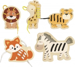De set bevat 5 Afrikaanse dieren (giraf, leeuw, tijger, vos en zebra) en 5 gekleurde veters. Gladde houten onderdelen met een veilig oppervlak liggen goed in kinderhanden en de levendige kleuren ondersteunen het herkennen van kleuren en het benoemen van dieren.