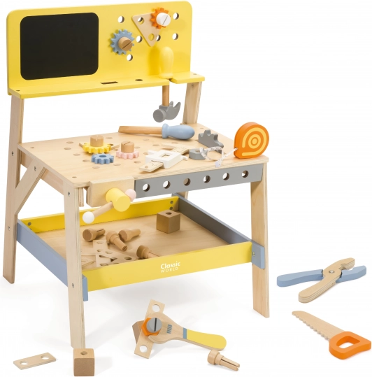 Ontdek de creatieve wereld van repareren en bouwen met de houten werkplaats van CLASSIC WORLD. Deze hoogwaardige set bevat 27 onderdelen, inclusief gereedschap en accessoires, en biedt ook een krijtbord voor het tekenen van plannen. Dankzij de stevige houten constructie zonder scherpe randen is hij veilig voor kinderen en ondersteunt hij de fijne motoriek, creativiteit en fantasie.
