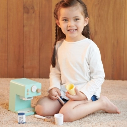 De set bevat alles wat kinderen nodig hebben om “koffie” te serveren: de koffiemachine, 2 kopjes, 2 lepeltjes, “melk” en een tamper/maatschep voor koffie. Het spel ondersteunt fijne motoriek, oog-handcoördinatie en sociale interactie.