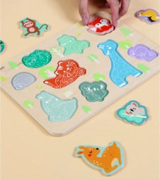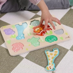 Gekleurde stukjes in de vorm van dieren motiveren kinderen om te puzzelen en helpen al vanaf 18 maanden de fijne motoriek en de oog-handcoördinatie te ontwikkelen.