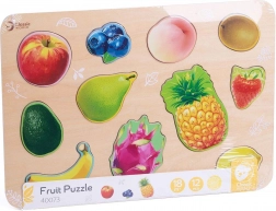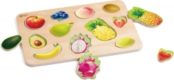 Elk stukje past in een specifiek uitsparing, waardoor kinderen het principe van sorteren en koppelen gemakkelijk begrijpen, terwijl ze de namen en kleuren van fruit leren.