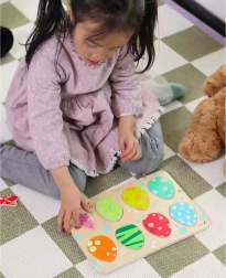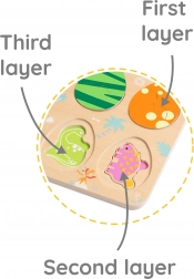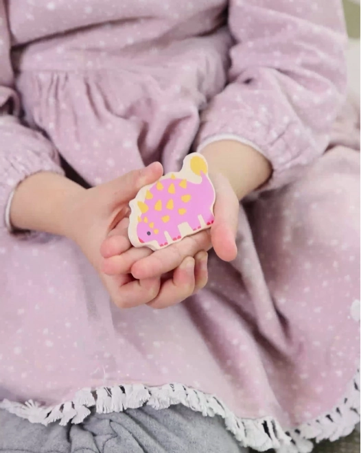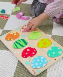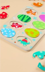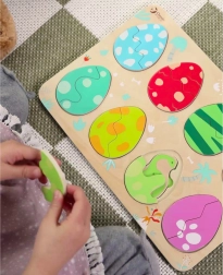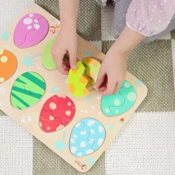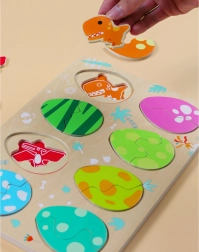 Deze kwalitatieve houten puzzel combineert plezier en leren. Dankzij de drie lagen kunnen kinderen stap voor stap dinosauwereieren onthullen, daaronder schattige dinosaurussen vinden en op de onderste laag de hintillustraties zoeken. De levendige kleuren en veilig afgewerkte stukken nodigen uit om steeds opnieuw te spelen.