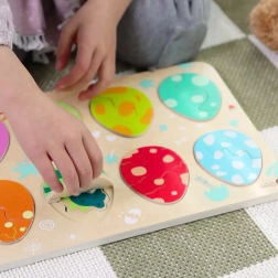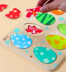 Ontdek de leuke houten puzzel van Classic World met het thema dinosauwereieren. De driedelige opbouw ondersteunt het leren van kleuren en vormen, logisch denken en fijne motoriek. Kinderen matchen de eieren met de verborgen dinosaurussen en ontdekken op de onderste laag eenvoudige afbeeldingen die helpen bij het juiste koppelen.