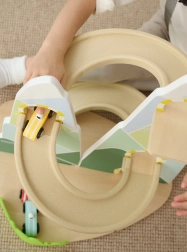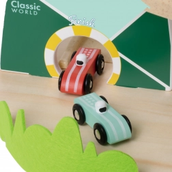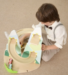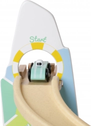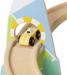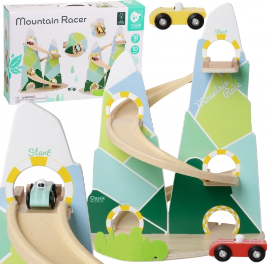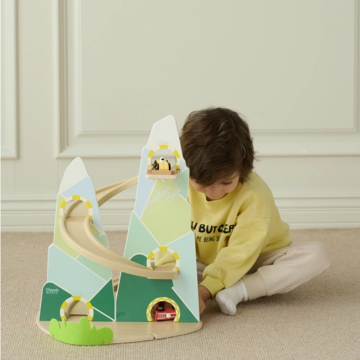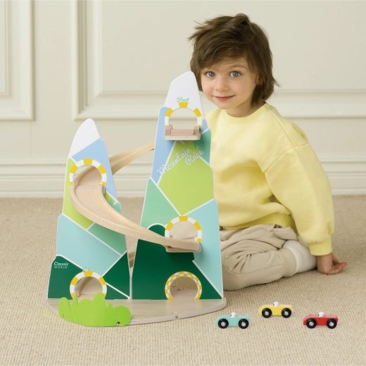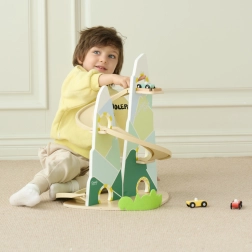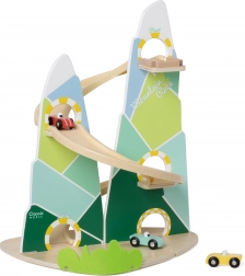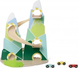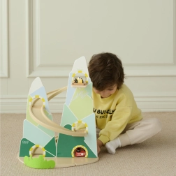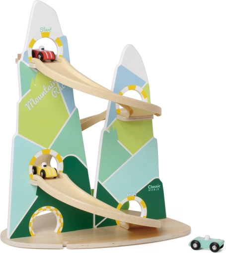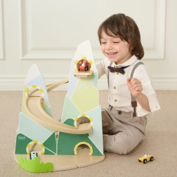 Deze originele berg-racebaan met de vorm van twee pieken is gemaakt van hoogwaardig hout en gelakt met niet-giftige verven in aangename pasteltinten. Kinderen vanaf 18 maanden kunnen 3 meegeleverde autootjes over de bochtige banen laten rijden, de rit observeren, kleuren leren en hun reactievermogen oefenen.