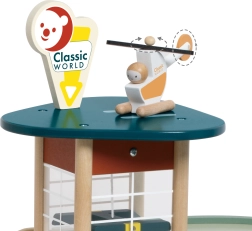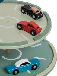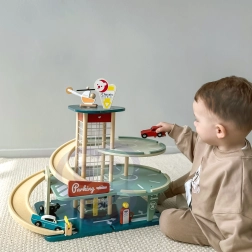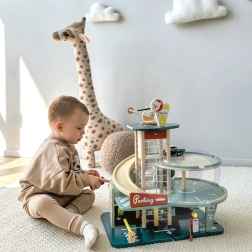 De retro garage, geïnspireerd op de jaren 50, is een geweldige keuze voor jonge auto- en techniekliefhebbers. Kinderen kunnen auto’s op drie verdiepingen parkeren, ze door de wasstraat rijden, tanken bij de brandstofpomp en de werkende lift gebruiken tot aan het dak, waar een helikopter wacht. Dankzij de bioplastic hellingen is verplaatsen tussen de niveaus eenvoudig en leuk.