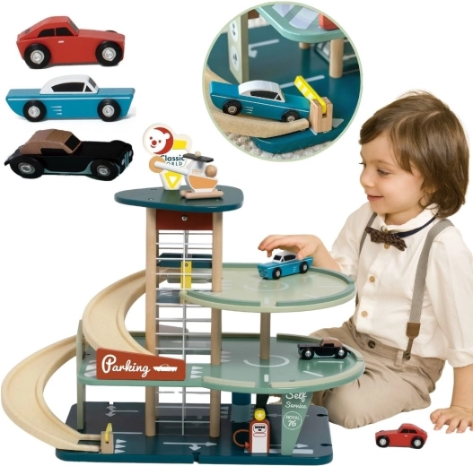 Stijlvolle houten parkeergarage geïnspireerd op de jaren 50 van het merk CLASSIC WORLD biedt drie verdiepingen vol plezier met een liftplatform, een spiraalvormige bioplastische helling, autootjes, een wasstraat, een tankstation en een helipad. Hoogwaardige materialen met FSC-certificering ondersteunen de fijne motoriek, verbeeldingskracht en sociale vaardigheden van kinderen vanaf 3 jaar.